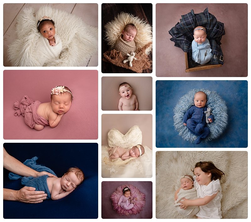 Your newborn baby will be carefully posed in the popular ‘sleeping baby’ style, and a RICH portfolio of newborn images will feature flattering coloured backdrops, wraps and props to offset your baby’s delicate skin.